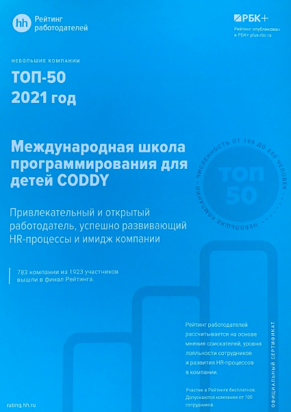 CODDY входит в «Топ-100 лучших работодателей России-2018-2022» по версии РБК+ и HeadHunter